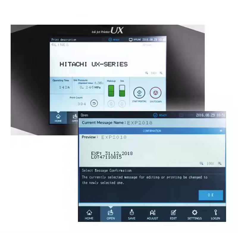 2.UX-D160W:The Standard model offers a well-equipped printer with several top-up options, reduced makeup consumption and clean & easy change of cartridge-type bottles. It is capable of up to 6 lines of printing. The Standard model offers up to 240 printable characters on 6 separate lines and a print rate of 1148 characters per second (Option up to 2563). The model comes with 300 message storage capacity (Option up to 2000 depending on data).